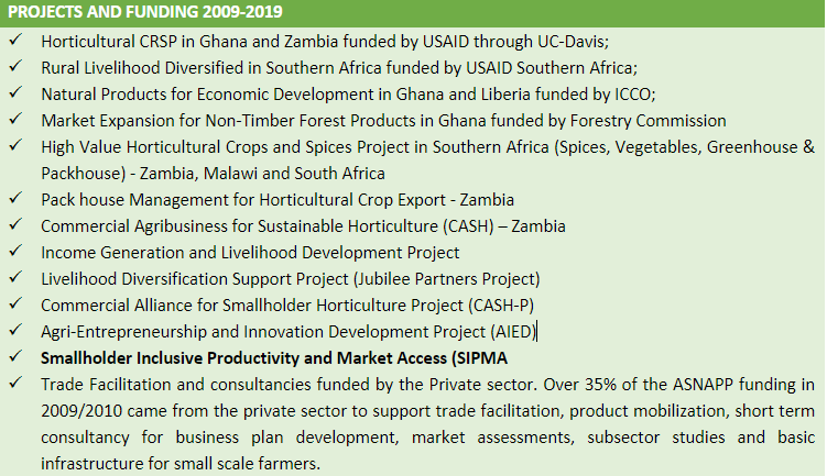 ASNAPP has established Strategic University partnerships with Stellenbosch University, Rutgers University, Kwame Nkrumah University of Science and Technology, the University of Ghana, and the University of Zambia to provide varied technical resources to farmers. These are done with a focus on enterprise development, market development and commercialization, economic analysis, and financial feasibility of technology and innovation and impact evaluations.